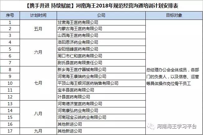 為全面落實總裁要求,提高溝通效率,促進集團與分子公司業(yè)務(wù)融合;同時導(dǎo)入規(guī)范化經(jīng)營管理體系,為分子公司解決相關(guān)問題,有效規(guī)避經(jīng)營風(fēng)險。集團人力資源部從5月份開始,聯(lián)合集團各部門,分期赴各分子公司,組織開展河南海王2018規(guī)范經(jīng)營溝通培訓(xùn)。