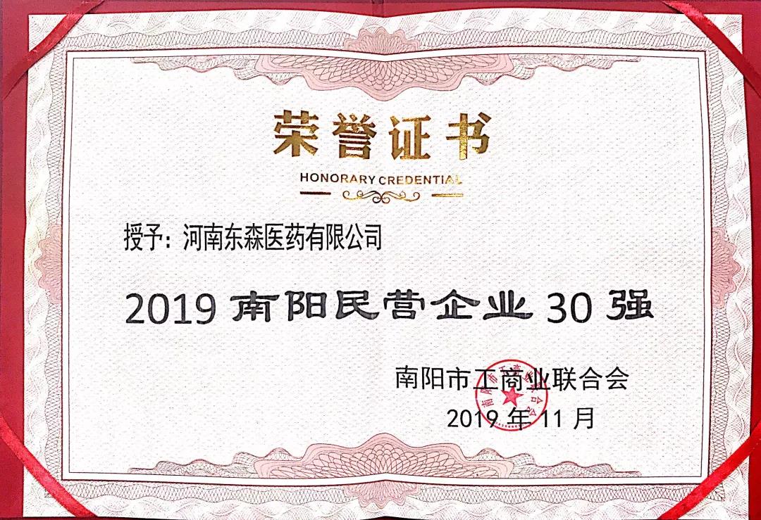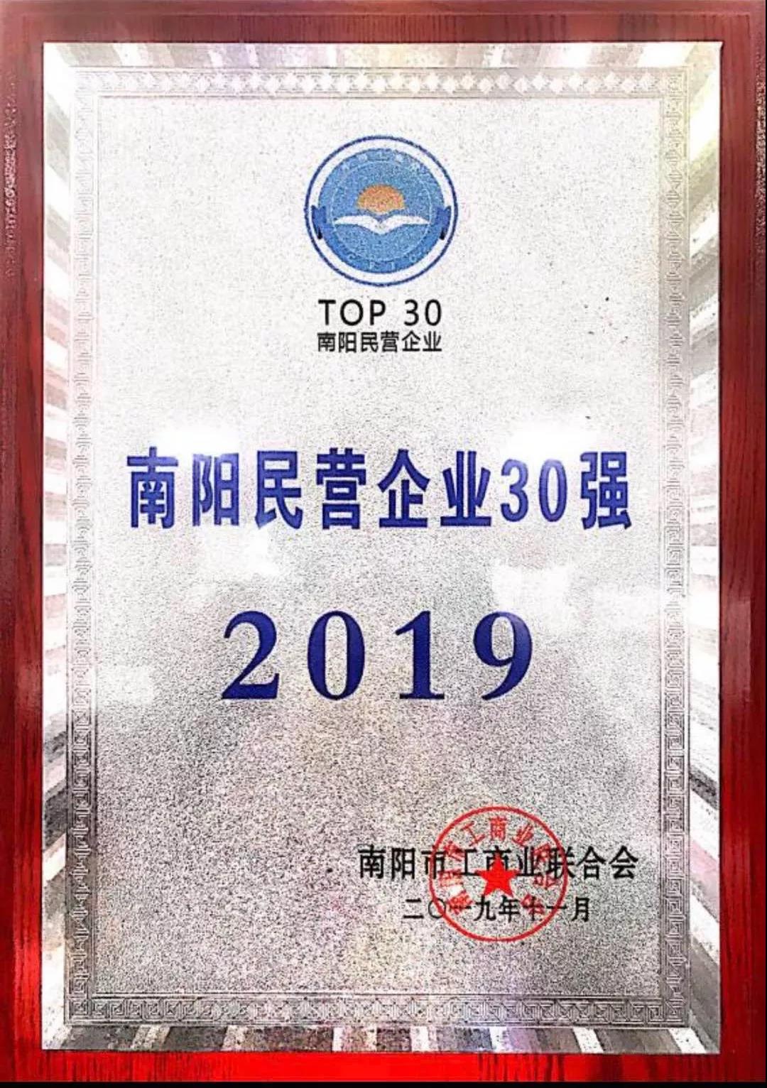 2019年度南陽民營企業(yè)30強-榮譽證書