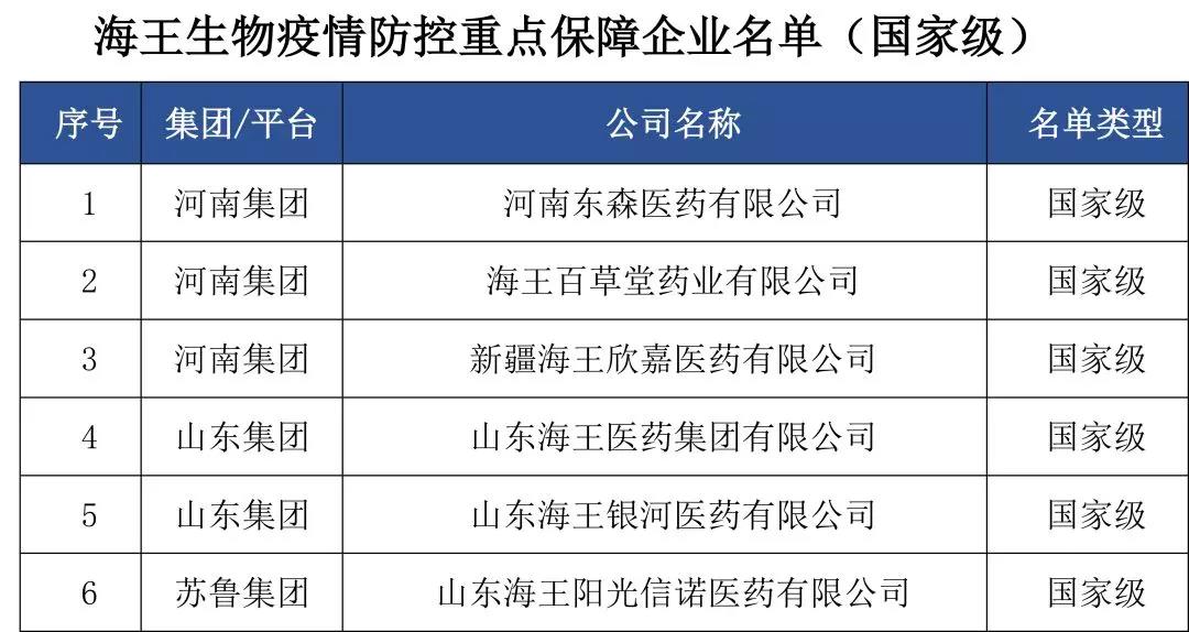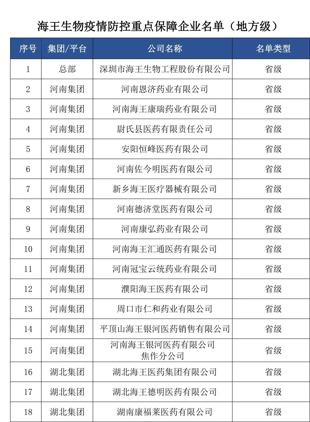 近日,全國及各地區(qū)疫情防控重點保障企業(yè)名單陸續(xù)公布。截至3月10日,海王生物本部入選省級“疫情防控重點保障企業(yè)名單”,6家子公司入選國家級“疫情防控重點保障企業(yè)名單”,34家子公司入選地區(qū)性“疫情防控重點保障企業(yè)”名單(其中省級22家,市級12家)。