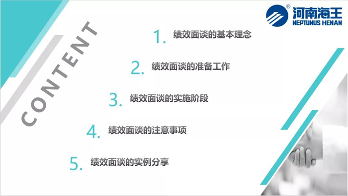 隨后,她從績(jī)效面談的基本理念、績(jī)效面談的準(zhǔn)備工作、績(jī)效面談的實(shí)施階段、績(jī)效面談的注意事項(xiàng)、績(jī)效面談的實(shí)例分享等五個(gè)方面進(jìn)行講授。